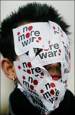 一名抗議者在臉上貼滿反對伊戰的標語。
