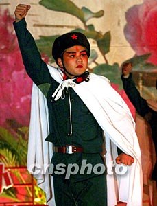 河南省安陽市超越集團在日前舉辦的一場“非公經濟之春”文藝晚會上,上演當年樣板戲《智取威虎山》中的共產黨員形象。超越集團有健全的共產黨組織健全。中新社記者:宋吉河