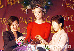 圣誕節即將到來之際,香港最大型的室內購物商場-海港城于11月21日率先亮起圣誕燈飾,今年海港城的機動燈飾以《閃爍之城》為主題,圖為明星梁詠琪(中)與海港城置業有限公司執行董事李玉芳(左)等啟動機動圣誕燈飾。作者:洪少葵