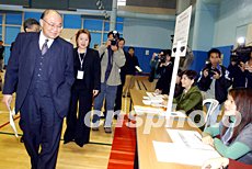 選舉管理委員會主席胡國興法官到達九龍公園投票站參觀,對準備就緒的投票站設施感到滿意。中新社記者:洪少葵