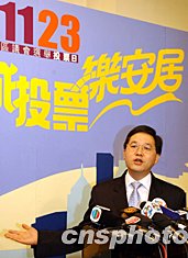 十一月二十二日,香港政制事務局局長林瑞麟在擔任電視節目“全城投票樂安居”嘉賓時呼吁香港市民珍惜明天的投票機會。中新社記者:潘索菲