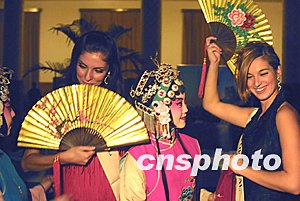 巴西小姐(左二)和葡萄牙小姐(右一)對中國京劇花旦演出的折扇情有獨(dú)鐘。中新社記者:廖文靜