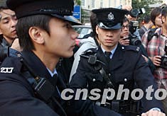 二零零三年香港特別行政區區議會選舉投票日十一月二十三日在香港十八個區同時展開,為保障選舉投票安全,警察在投票站加強治安管理。 中新社記者:錢興強