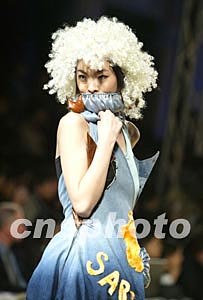 正在北京舉行的中國國際時裝周上,設計師以SARS字樣配以簡潔的服裝與面部圍巾,提醒人們預防SARS卷土重來。中新社記者:毛建軍