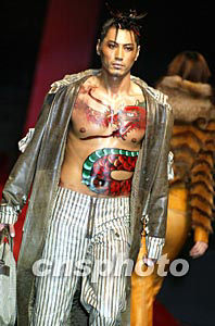 喜得龍.計文波時裝發布會二十五日晚在中國國際時裝周上舉行,一名男模特身繪火龍出場,寓意中國時裝品牌發展的龍馬精神。中新社記者:毛建軍