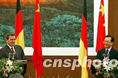 中國國務院總理溫家寶、德國總理施羅德十二月一日在出席中德雙方簽字儀式后,共同會見中外記者。中新社記者:滿會喬