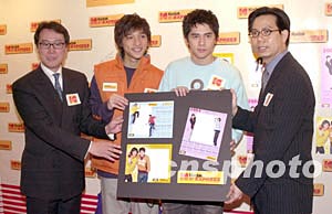 樂壇組合Shine成員黃又南、徐天佑12月2日在香港出席《Kodak數(shù)碼沖曬多面睇》記者會(huì),Kodak更設(shè)計(jì)了一套三款的「Kodak ×Shine 2004慈善相片年歷」予香港世界宣明會(huì)作慈善用途。中新社記者:鄧慶樂