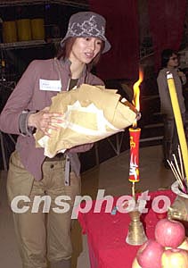 歌星梁詠琪12月5日在香港出席香港將軍澳電視城出席《第十五屆CASH流行曲創作大賽》彩排及拜神儀式,圖為梁詠琪在拜神儀式上化緣,祈求6日晚在大賽中有優異演出及獲獎。中新社記者:鄧慶樂