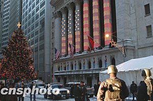 紐約證券交易所正門上方懸掛著中國國旗,準備迎接首次訪美的中國總理溫家寶為周一股市開盤鳴鐘。證交所門前警備森嚴,警車重重。中新社記者 陳建 攝