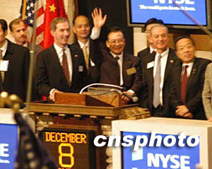 美東時間十二月八日上午,首次訪美的中國總理溫家寶來到紐約證券交易所,為周一股市九點半開盤鳴鐘。中新社記者 陳建 攝