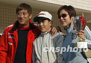 二OO三年全國卡丁車錦標賽11月30日在廣東三水舉行,柯受良之子柯有謙(中)獲得國家少年組冠軍,柯受良夫婦與兒子共同分享勝利喜悅。來自全國各地的五十多名選手參加本次比賽。中新社記者:趙振清