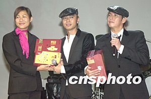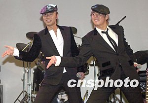 歌星譚詠麟、李克勤12月10日在香港出席《左麟右李04開心演唱會》記者會,擅長搞氣氛的譚詠麟及李克勤會上模仿米高積遜臺風(fēng),增添笑料。作者:鄧慶樂