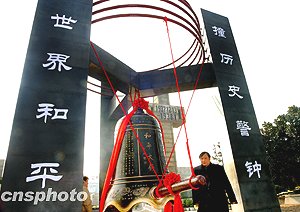 中新社南京十二月十一日電(記者 陳光明)今天,為悼念南京大屠殺同胞遇難六十六周年而鑄造的“和平大鐘”在南京江東門侵華日軍南京大屠殺遇難同胞紀念館安裝完畢。明天起,“悼念南京大屠殺三十萬同胞遇難六十六周年儀式暨南京國際和平日集會”系列活動將陸續舉行。