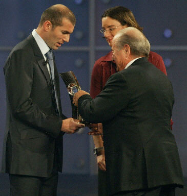 中新網(wǎng)12月15日電 國(guó)際足聯(lián)2003年度頒獎(jiǎng)儀式15日在巴塞爾開始舉行,齊達(dá)內(nèi)壓過羅納爾多與亨利,第3次當(dāng)選世界足球先生。