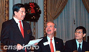 中國人壽董事長王憲章(左)向紐約證交所董事會臨時主席兼首席執行官約翰·里德(中)、國壽上市案的全球聯席協調人——中國國際金融有限公司代表朱云來(右)等致辭。