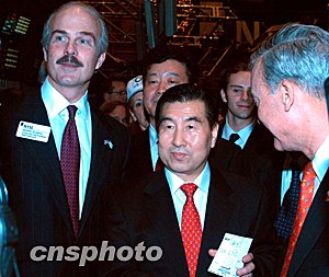 中國人壽董事長王憲章(中)在紐約證交所董事會臨時主席兼首席執行官約翰·里德(右)等陪同下,在交易大廳中以首日開盤價二十三點二五美元,購買了一百股國壽股票。