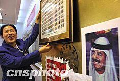 由香港著名畫家劉宇一設計的“新千年世界元首郵票大全”十九日起在北京貴友大廈獨家銷售,這組由一百九十位國家元首畫像構成的世界張數最多的大聯張郵票售價兩千九百元人民幣并需要提前預定。其中倍受矚目的伊拉克前總統薩達姆頭像郵票更被放大張貼,成為這組郵票的銷售熱點。中新社記者:廖文靜