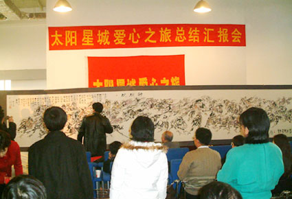 太陽星城愛心之旅隨團著名畫家李繁民,傾心力作了八米巨畫《中華五十六駿圖》贈送給香港冠城集團,以表達對企業支持愛心事業謝意。石家莊殘聯理事長王金斗專程從河北趕來,代表石家莊市30萬殘疾人對太陽星城愛心之旅采訪團的奉獻精神表示感謝。在報告會舉行之際,太陽星城愛心之旅所到之處的各級殘聯、志愿者組織和愛心人士發來了一百多封賀信。