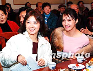 圣誕前夜,北京《夢回紅樓》酒家召集電視連續劇《紅樓夢》部分原班人馬茶敘,宣布電視劇《紅樓夢》重拍正式起動。圖為出席會議的原《紅樓夢》中妙玉的扮演者姬陪杰(右)和賈惜春的扮演者胡澤紅(左)。中新社記者:王麗南