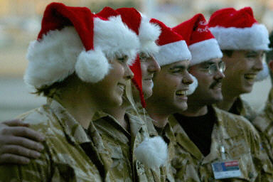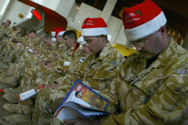 12月24日,在伊拉克南部城市巴士拉國際機場的英軍基地,駐伊英軍集體歡度圣誕平安夜。