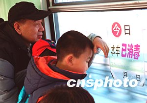 12月27日廣東省宣布發現一例SARS疑似病例后,北京各公共交通工具包括剛剛開通的地鐵八通線繼續堅持嚴格的消毒制度。作者:張雷