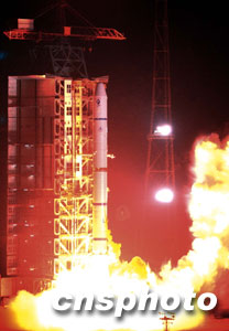 北京時間三十日凌晨三時許,中國“雙星計劃”的第一顆衛星“探測一號”在西昌衛星發射中心由“長征二號丙”改進型運載火箭發射升空。至此,二00三年中國六次航天發射全部告捷,也為中國航天年畫上一個圓滿的句號。本次衛星發射是中國運載火箭迄今為止最高的一次飛行,“探測一號”也因此成為中國目前軌道距地球最遠的一顆衛星。 中新社記者 張煒 攝