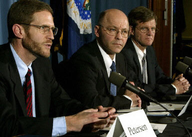 美國(guó)農(nóng)業(yè)部官員肯尼思·彼得森(左)29日在華盛頓的發(fā)布會(huì)上說(shuō),調(diào)查人員發(fā)現(xiàn)有問(wèn)題的牛肉已經(jīng)流入華盛頓州、俄勒岡州、加利福尼亞州、內(nèi)華達(dá)州、阿拉斯加州、夏威夷州、愛(ài)達(dá)荷州、蒙大拿州和關(guān)島的食品零售市場(chǎng)。美國(guó)食品和藥物管理局說(shuō),有關(guān)部門已經(jīng)下令在這些地區(qū)范圍內(nèi)回收總計(jì)4.5噸的牛肉。