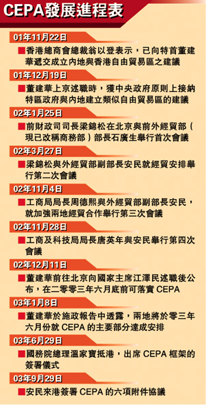在二零零三年六月簽署的CEPA包括貨物貿易、服務貿易和貿易投資便利化三部分。其中,貨物貿易部分規定,自二零零四年一月一日起,對輸往內地的二百七十三種原產于香港的貨物實行零關稅。(戴慶成)
