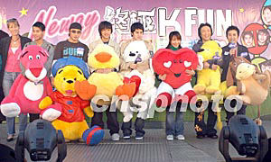 歌星梁漢文、方力申、組合Shine兩人、林嘉欣、鄭中基(左二起)1月6日在香港金鐘添馬艦舉行之《環球嘉年華2003/4》出席“Neway終極K Fun嘉年華”演唱會作表演嘉賓,獲環球嘉年華主辦機構送上大型毛公仔。作者:鄧慶樂