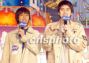 組合Shine兩人1月6日在香港金鐘添馬艦舉行之《環球嘉年華2003/4》出席「Neway終極K Fun嘉年華」演唱會作表演嘉賓,并呼吁歌迷上臺游戲。作者:鄧慶樂