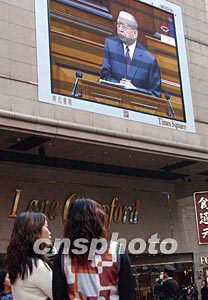 香港特別行政區行政長官董建華,元月七日在香港立法會上發表施政報告,在時代廣場許多市民通過電子顯示屏觀看立法會現場轉播實況。中新社記者:錢興強