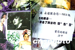 香港著名藝人梅艷芳喪禮將于1月11日設靈, 12日出殯,10日各地歌迷陸續來到香港殯儀館以各種形式悼念香港歌后梅艷芳.圖為歌迷寫上懷念的心意卡。中新社記者:洪少葵
