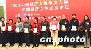 中國(guó)二零零三年度十大經(jīng)濟(jì)女性年度人物揭榜儀式十日在北京人民大會(huì)堂拉開(kāi)序幕,圖為楊綿綿的代表、江佩珍、錢(qián)月寶、江小娟、袁秀梅、謝企華的代表、王蘭、杜麗華、張小梅、馬嵐十位女性合影(由左至右)。中新社記者:廖文靜