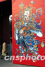 圖:北京地壇巨幅門神貼畫迎春節(jié)