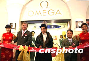 瑞士著名手表品牌歐米茄旗艦店1月13日在北京東方君悅酒店商業區開業,歐米茄中國及香港區副總裁盧克勤先生(左二)與歐米茄形象大使任賢齊(中)到場剪彩。中新社記者:趙振清