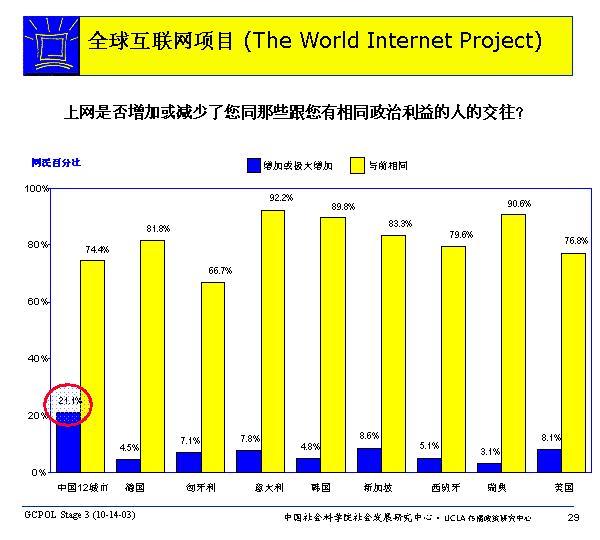 上網(wǎng)沒有改變大多數(shù)網(wǎng)民同那些有相同政治利益的人的交往數(shù)量。然而,少數(shù)網(wǎng)民報告使用互聯(lián)網(wǎng)增加了與這些人的交往;這類網(wǎng)民最多的是在中國,21.1%的網(wǎng)民報告他們增加或極大增加了同這類人的交往。