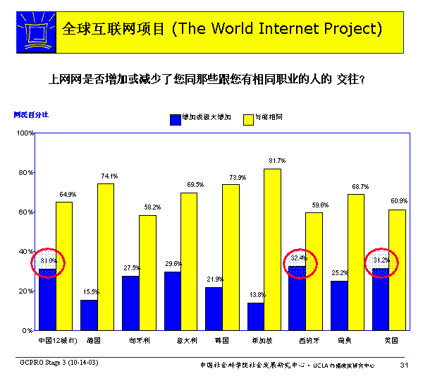 用網(wǎng)沒有改變大多數(shù)網(wǎng)民同那些從事相同職業(yè)的人的交往數(shù)量。相當(dāng)數(shù)量的網(wǎng)民報告他們用網(wǎng)增加了與這些人的交往;這類網(wǎng)民最多的是在西班牙,32.4%的網(wǎng)民報告他們增加或極大增加了同這類人的交往。