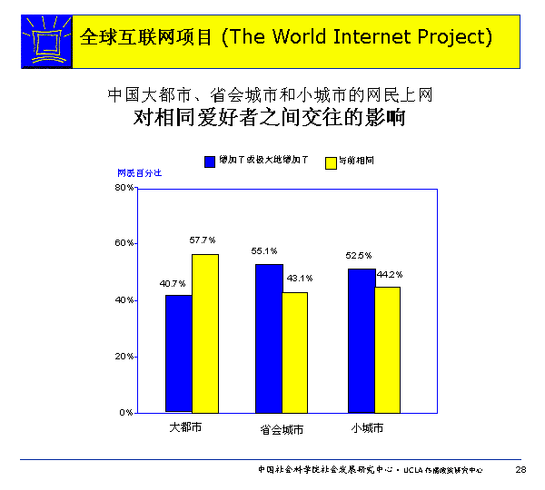 從中國的調查數據看,大都市網民認為上網增加了他們跟有相同業余愛好或相同娛樂活動的人的交往的人數要明顯少于省會城市和小城市。
