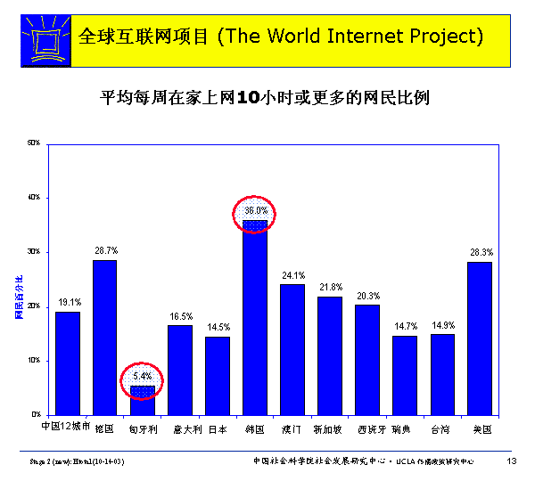 在WIP的國家里,韓國的每周在家上網平均10小時或更多的網民比例最高。36%的韓國網民每周在家上網平均10小時或更多,匈牙利網民只有5.4%如此。