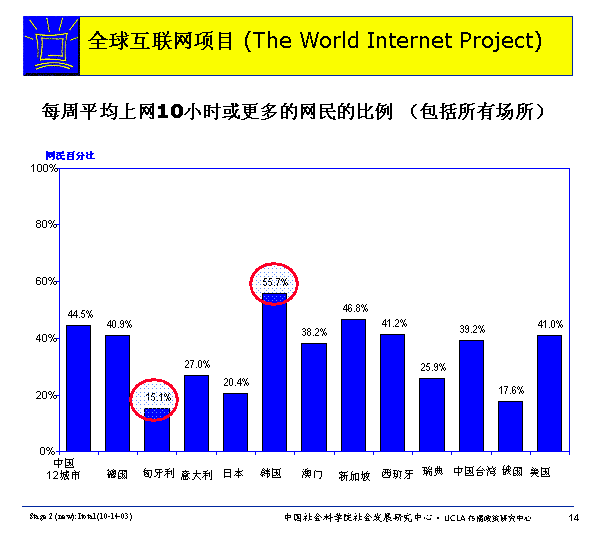 每周上網時間最多的是韓國人,55.7%網民每周上網10小時或更多(包括所有場所) ,匈牙利比例最低,只有15.1%的網民。