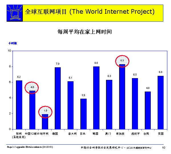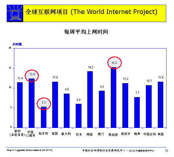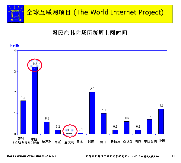 網(wǎng)民每周在家庭、辦公室或?qū)W校之外的場所(在發(fā)達國家,有可能是在圖書館,而一般國家則更可能是在網(wǎng)吧)上網(wǎng)的平均時間多者可達3.2小時(中國),少則幾乎為零(意大利)。