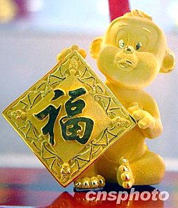 2004年1月17日,安徽省淮北市一家珠寶首飾店內一尊尊純金打造栩栩如生的“金猴”,準備在春節黃金周期間,吸引消費者選購。猴年將至,猴金飾品日益成為人們的新寵。謝正義 攝