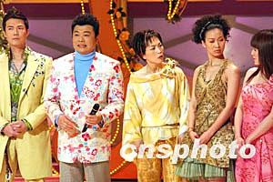 2004年度國際華裔小姐競選決賽一月十七日晚在香港舉行,香港明星陳小春與參賽佳麗曹敏莉在華裔小姐競選晚會上。 作者:錢興強