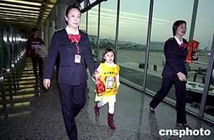 無人陪伴的臺灣小朋友王正心在機場工作人員的幫助下乘機。作者:陳文