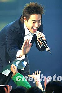一月十八日晚,中央電視臺《音樂現(xiàn)場》春節(jié)特別節(jié)目“紅歌匯2003之?dāng)y手同行、治安之歌——慰問首都公安干警演唱會”在北京舉行,著名歌手潘瑋柏受到歌迷的熱烈歡迎。中新社記者:盛佳鵬