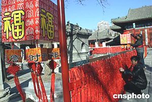 猴年春節(jié)在即,第三屆北京民俗文化節(jié)暨第六屆東岳廟文化廟會(huì)一月二十日即將在著名的東岳廟舉辦。十九日工作人員正在加緊布置“福”路,迎接祥和興旺的新春。中新社記者:張勤