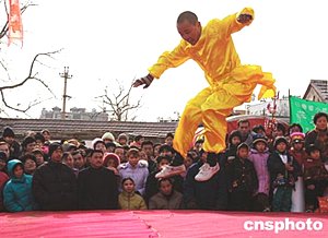 22日中國(guó)猴年第一天,北京新奧少林學(xué)校的學(xué)生在北京廠甸兒廟會(huì)上龍騰虎躍,出手不凡的少林武功令人大開(kāi)眼界。中新社記者:鄒憲