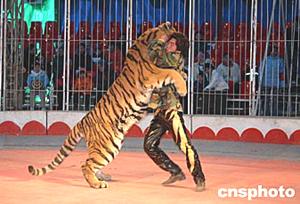 22日大年初一,北京眾多市民一早趕往地壇廟會(huì),欣賞本屆廟會(huì)的特色節(jié)目——歡樂(lè)馬戲總動(dòng)員。驚心動(dòng)魄的人虎大戰(zhàn)讓觀眾大飽眼福。作者:徐曦弋