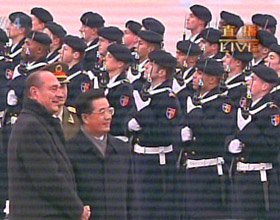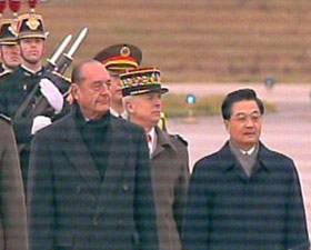 在希拉克陪同下,胡錦濤走上紅地毯,在法國軍樂隊演奏的中法兩國國歌聲中,檢閱了法國三軍儀仗隊。
