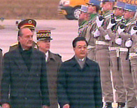 中國國家主席胡錦濤乘專機于巴黎時間下午兩點四十分抵達巴黎奧利機場,開始對法國進行國事訪問,法國總統希拉克夫婦親自到機場迎接。(電視截圖)